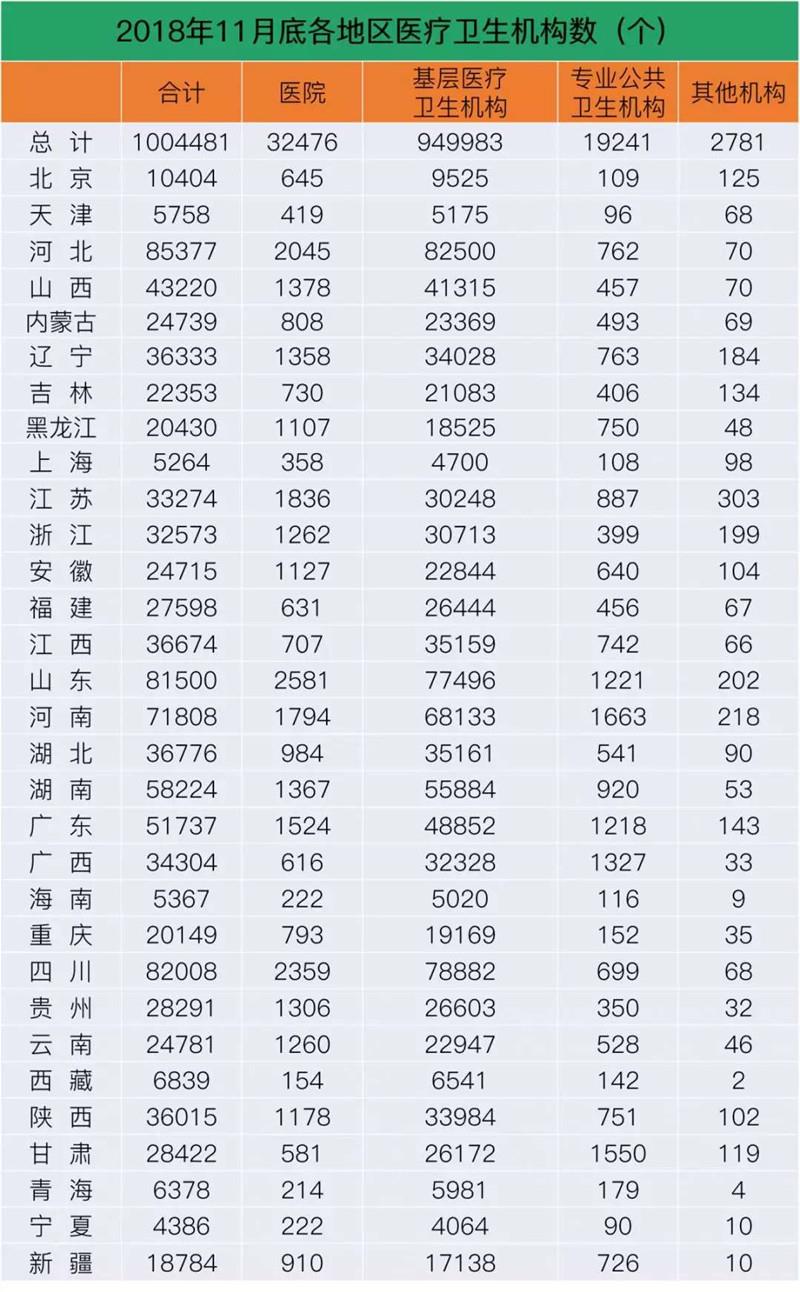 5月22日,國家衛(wèi)生健康委發(fā)布《2018年我國衛(wèi)生健康事業(yè)發(fā)展統(tǒng)計(jì)公報(bào)》(下稱《公報(bào)》)。數(shù)據(jù)顯示,2018年末,全國醫(yī)療衛(wèi)生機(jī)構(gòu)總數(shù)達(dá)997434個(gè),其中醫(yī)院33009個(gè)。